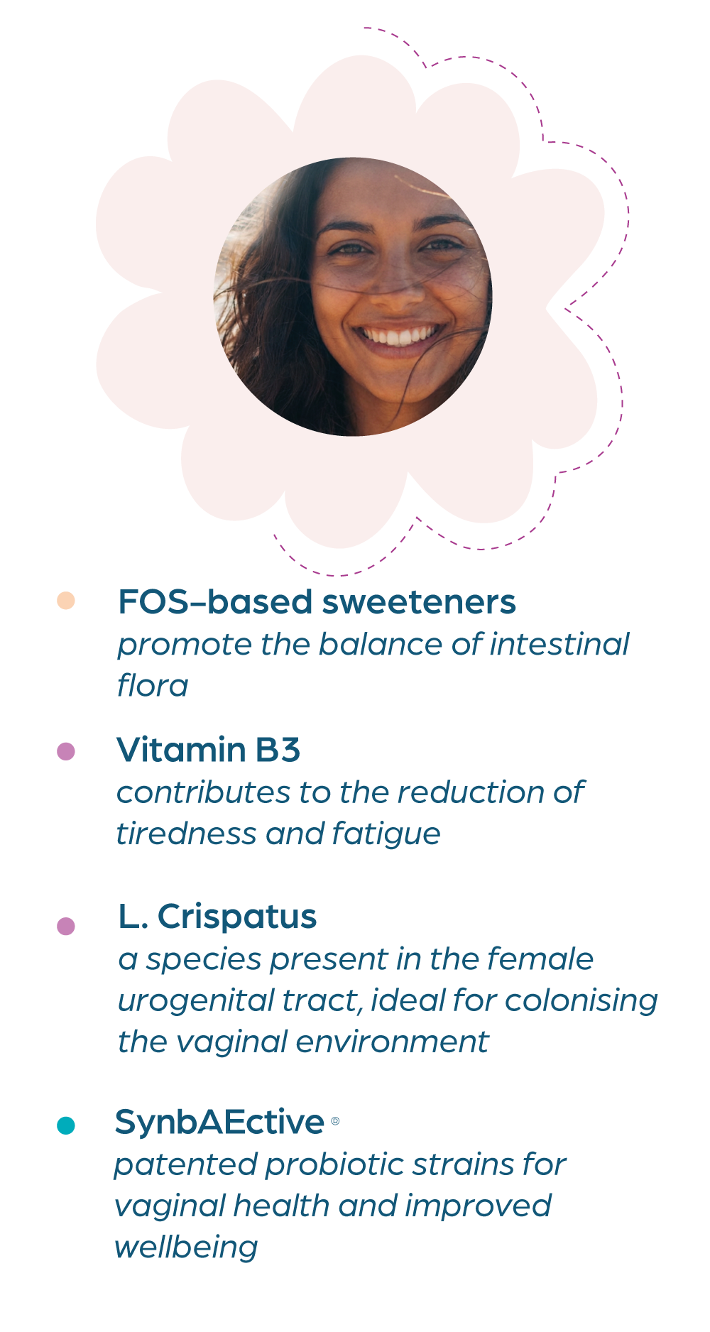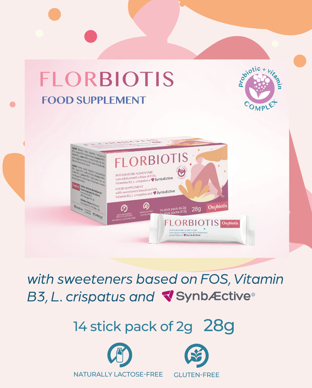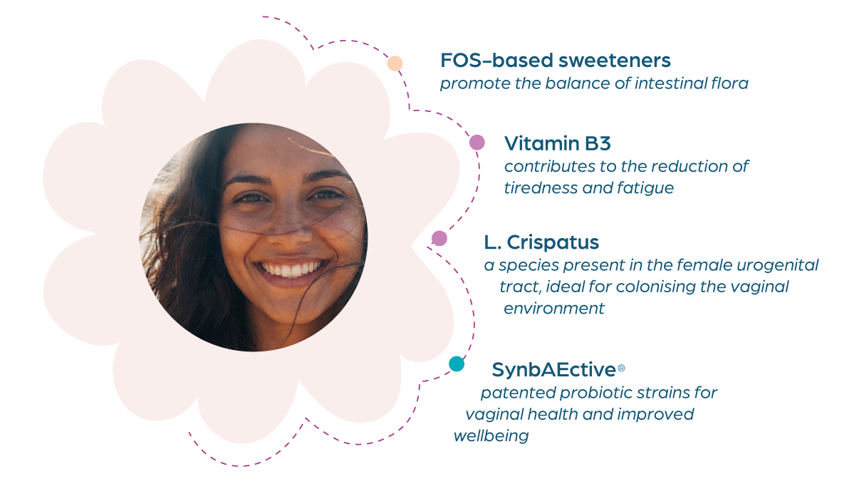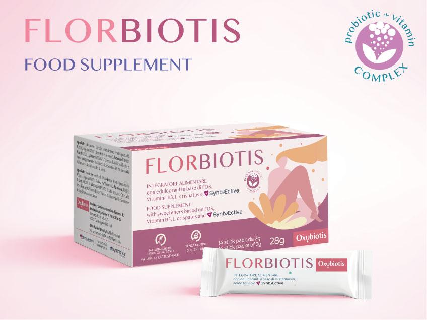 FLORBIOTIS is a food supplement based on Fructoligosaccharides, Vitamin B3, L. crispatus and