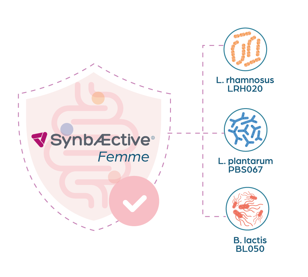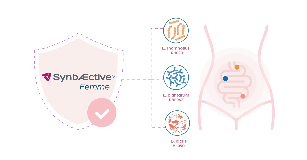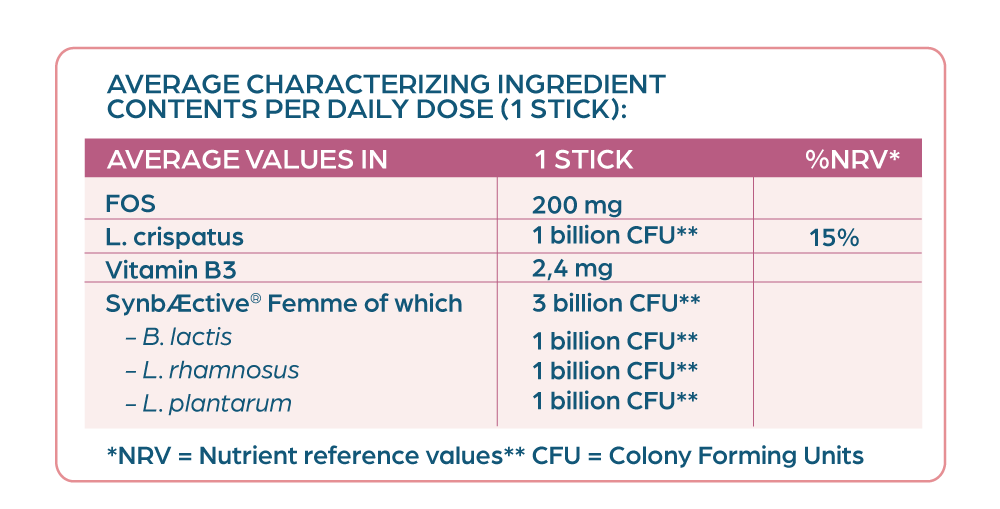 INGREDIENTS: Sweetener: erythritol; Maltodextrin; Fructoligosaccharides (FOS); L. crispatus LCR031; SynbÆctive® Femme (L. rhamnosus LRH020, B. lactis BL050, L. plantarum PBS067); Acidity regulator: Citric acid; Anti-caking agent: Silicon dioxide; Vitamin B3 (Nicotinamide); Sweetener: Steviol glycosides from Stevia.